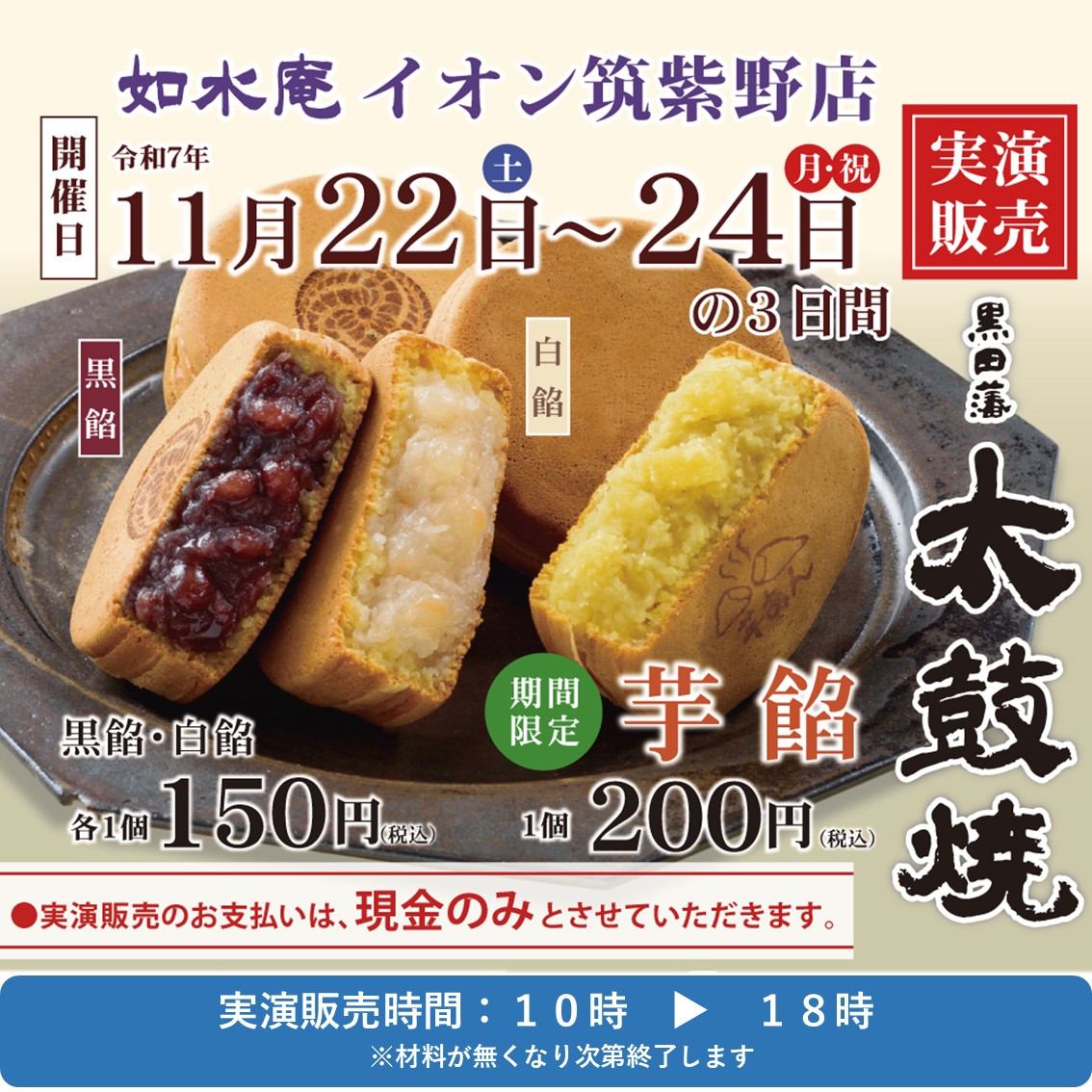 予告【如水庵】11月 黒田藩太鼓焼実演販売のお知らせ