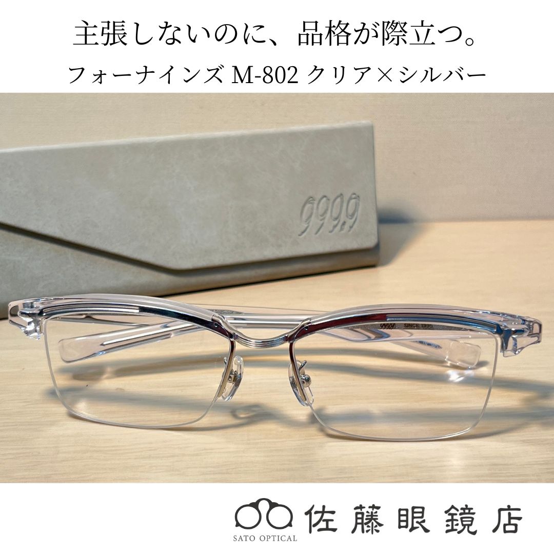【佐藤眼鏡店】フォーナインズ M-802クリア×シルバー|上質さと快適性を極めた大人の一本