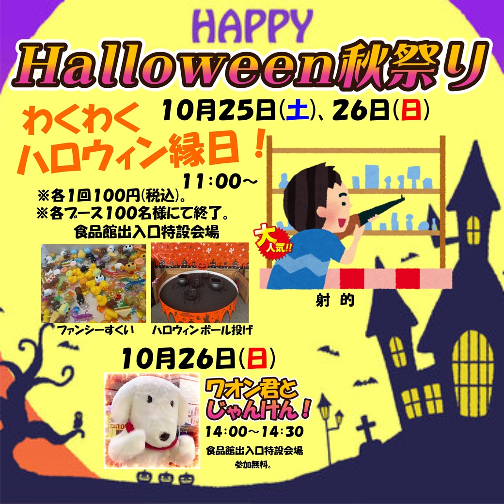 ♦10/25 【食品館出入口外特設会場にて】 🎃わくわくハロウィン縁日 11:00~ ※各1回100円(税込) ※各ブース100名さまにて終了 🎃ワオン君とじゃんけん 14:00~14:30 ※参加無料