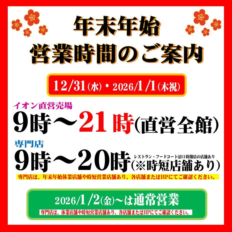 <イオン若松店>年末年始営業時間のお知らせ