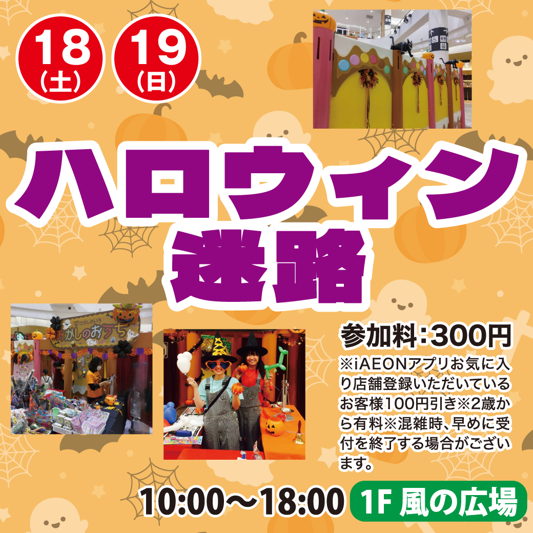 ハロウィン迷路 10月18日(土) 10月19日(日) 10:00~18:00 1階 風の広場 参加料:300円 ※iAEONアプリお気に入り店舗登録いただいている お客様100円引き ※2歳から有料 ※混雑時、早めに受付を終了する場合がございます。