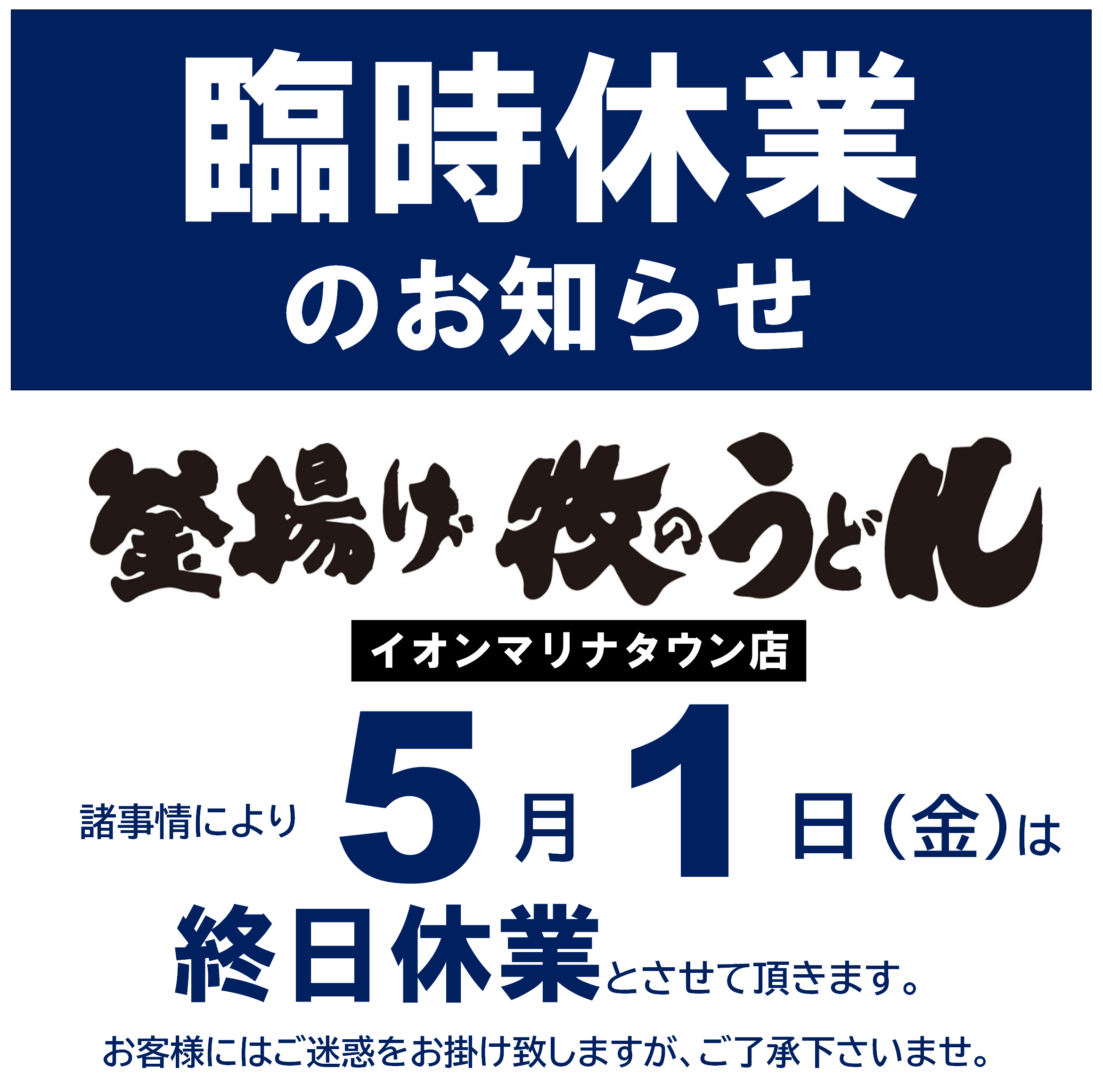 <釜揚げ まきのうどん>臨時休業のお知らせ