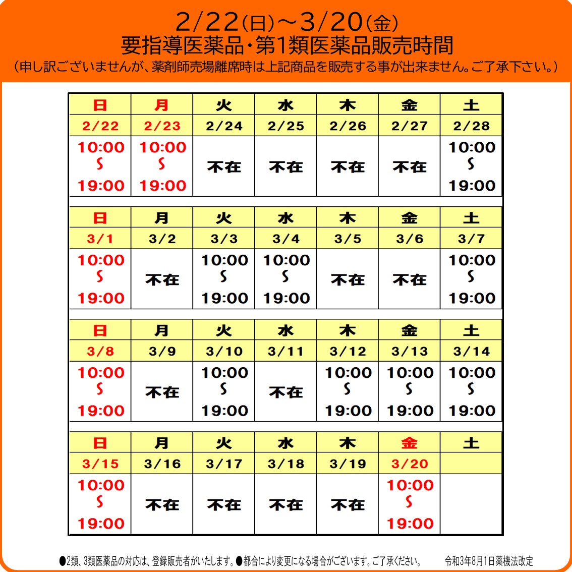 <イオン都城店>要指導医薬品・第1類医薬品販売時間