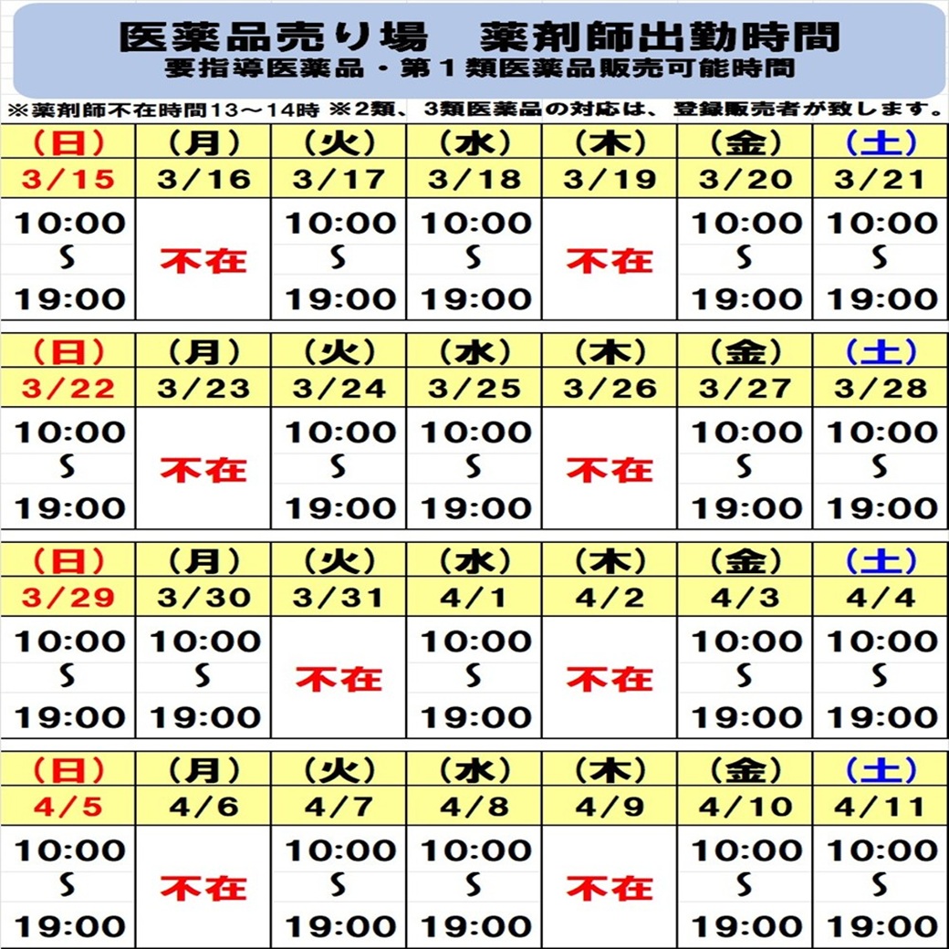 【イオンパークプレイス大分店】医薬品売場 薬剤師出勤時間のお知らせ